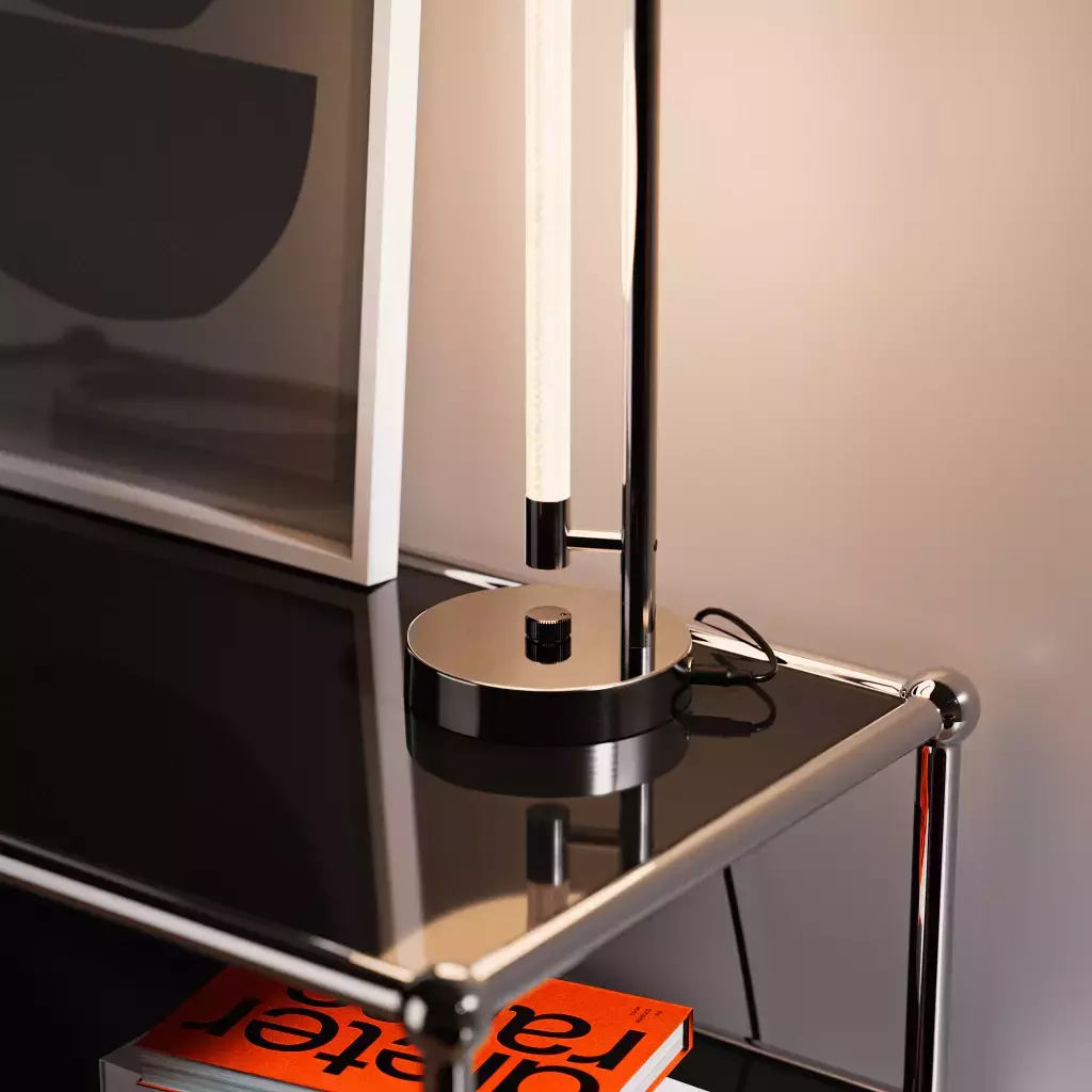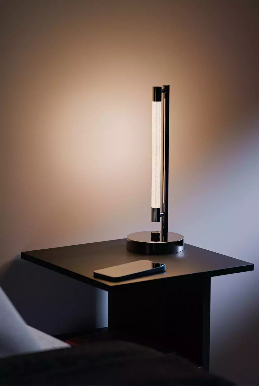 Acero y soga trenzada, con sistema de encendido y apagado, capacidad de ajustar la intensidad lumínica.